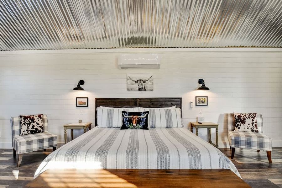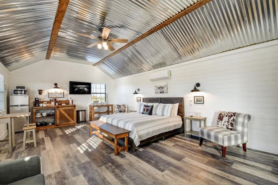 Welcome to Holy Cow Cottage, a charming studio that is one of four cottages nestled on 10 serene acres just a short 10-minute drive from historic Main Street. This quaint yet modern abode features a convenient kitchenette, luxurious king-sized bed, and spacious walk-in shower. Embrace the communal spirit of the shared "Party Barn" gazebo, offering cornhole boards, beautiful hill country views and an opportunity for stargazing. Your perfect blend of relaxation and socialization awaits.