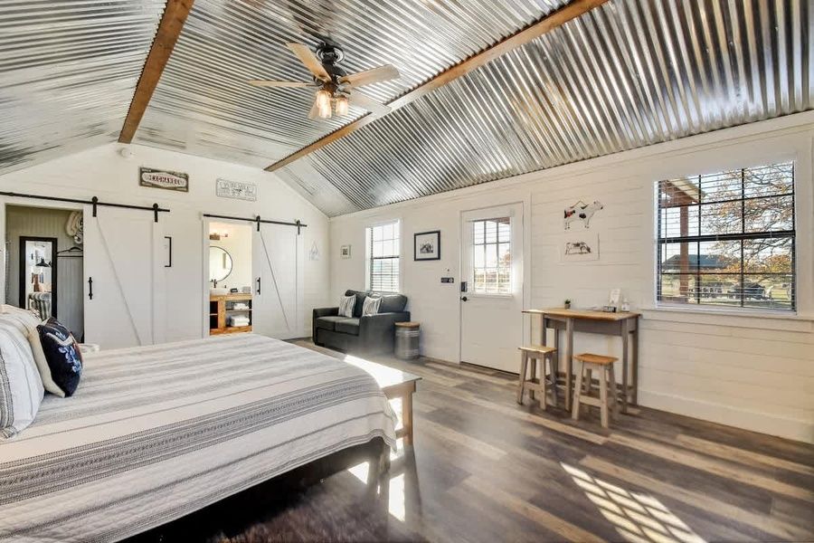 The cottage's modern farmhouse charm harmonizes with the surrounding pastures, paying homage to the local cattle and reflecting the area's rural heritage. Inside, the space combines rustic elements with modern conveniences. Beautiful flooring adds a touch of elegance while creating a cozy atmosphere. High-speed Fiber Internet and a mounted 50-inch smart TV is provided for streaming entertainment, catering to relaxation needs. Inside the bedroom you will find a delightful king bed, with an en-suite bathroom and walk-in closet.