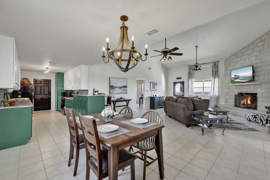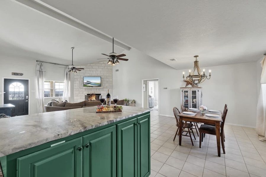 Nestled on 3 expansive acres of serene Hill Country landscape, this property offers a captivating blend of open-concept living and outdoor tranquility. The large living area welcomes guests with an inviting fireplace, complemented by a Smart flat-screen TV—a perfect setup for cozy evenings or entertaining friends. Sink into the plush embrace of a large sectional, creating a space where relaxation takes center stage.