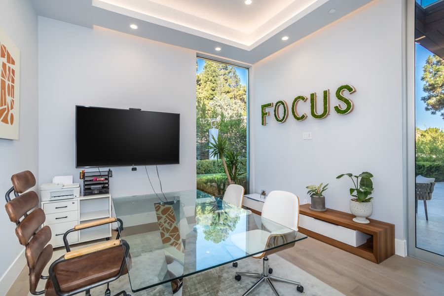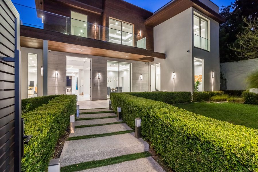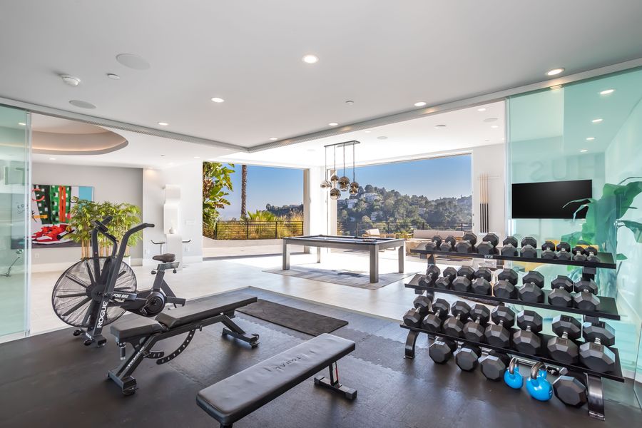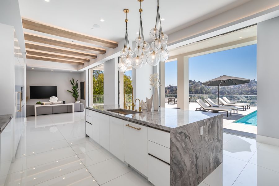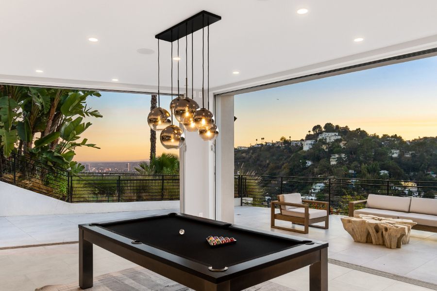 This newly built modern home boasts beautiful custom finishes throughout and serene views of the hills and city lights. Large windows and disappearing walls of glass make for the perfect indoor/outdoor living while filling the space with natural light and framing the impressive views. The main level includes a formal living room with linear marble fireplace, an elegant dining room, family room with built-in bar, chef's kitchen with marble countertops and backsplash, an expansive terrace with BBQ, waterfall, and infinity-edge pool, as well as a spacious guest bedroom. Upstairs, each of the dual primary suites features walk-in closets and custom bathrooms with no expenses spared. In addition, there are two large guest suites. The lower level boasts a beautiful entertainment area with a home theater, wine cellar, pool table/media room, and a custom home gym decked out with the newest technology. The impressive auto gallery comes replete with a turntable and can fit 6 cars. Located 5 minutes away from the Sunset Strip with some of the best shopping and dining in town.