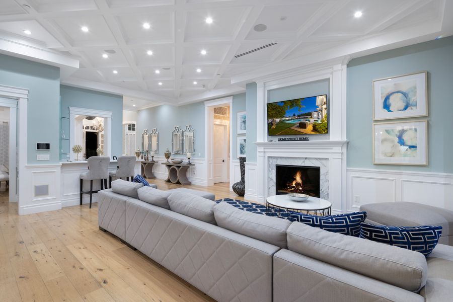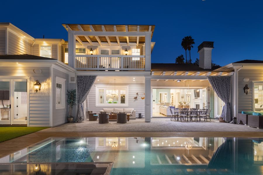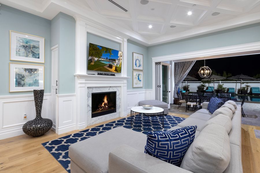 Newly Built Stunning Cape-Cod home featuring most luxurious and top of the line features corner lot and cul-de-sac street ending. The front of the property features 3 single garage doors and a large front yard. The grand entrance welcomes you into the high ceiling Formal family room with floor-to-ceiling windows overlooking the front yard and a fireplace; the rest of the house and dining room features stylish wallpaper and wainscoting, leading you into the dry bar area with lots of storage and ice-making machine. Kitchen features floor to ceiling custom white cabinets with a large center navy color Kitchen island, top of the line stainless steel Miele appliances that include, full-size wine fridge, two dishwashers, 6 burner stove, custom shiny hood, 60? refrigerator and freezer, convection oven, full-size oven, heating tray, Miele Coffee Machine and also a built-in microwave. Butler’s nook and Large walk-in pantry featuring floor-to-ceiling shelving and Kitchen island also has a utility sink and custom pendants lighting overlooking into the open concept family /TV room with beautifully designed ceilings, fireplace, recessed lighting and custom accordion doors overlooking the backyard. The first level Master Bedroom features a large walk-in closet with a spa-like master shower that includes a large walk-in shower, oversized bathtub, double vanities and designated makeup area with 2 his and hers private toilet rooms. The Master bedroom features a new custom bed frame and a stunning chandelier, also a large fireplace and sitting area. Another 2 en-suite bedrooms are located on the main floor as well as a home theater room with soundproof walls and expectational equipment and a snack bar area. The laundry room has its own designated room that also includes a small kitchenette for extra cooking space when preparing to host. The second level features another presidential suite-like master bedroom with a large balcony overlooking the stunning valley views and another ensuite bedroom. Home also features a Control 4 System that controls each and every aspect of the house, a central vacuum system and camera security system. The Luxurious entertainer’s backyard features a chef’s BBQ area with full appliances for hosting, an oversized fire pit for family gatherings, a large covered patio, and the stunning salt-water infinity-edge pool and spa. This property is one of a kind being mainly one story. Located in Price Tarzana South of the Blvd location near the freeway and lots of shops.