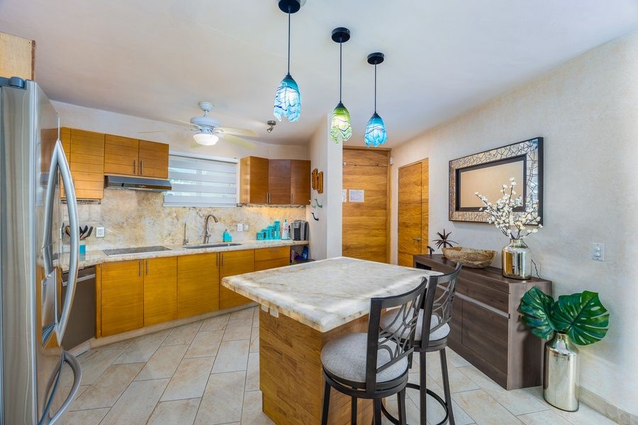 Two bedroom two bath with queen bed and bunk beds, Pull out sofa in the living room, great kitchen with an island, bar stools, and all appliances. Balcony overlooks Costa Dorada pool. Beachfront