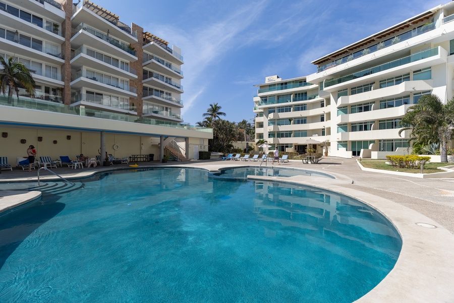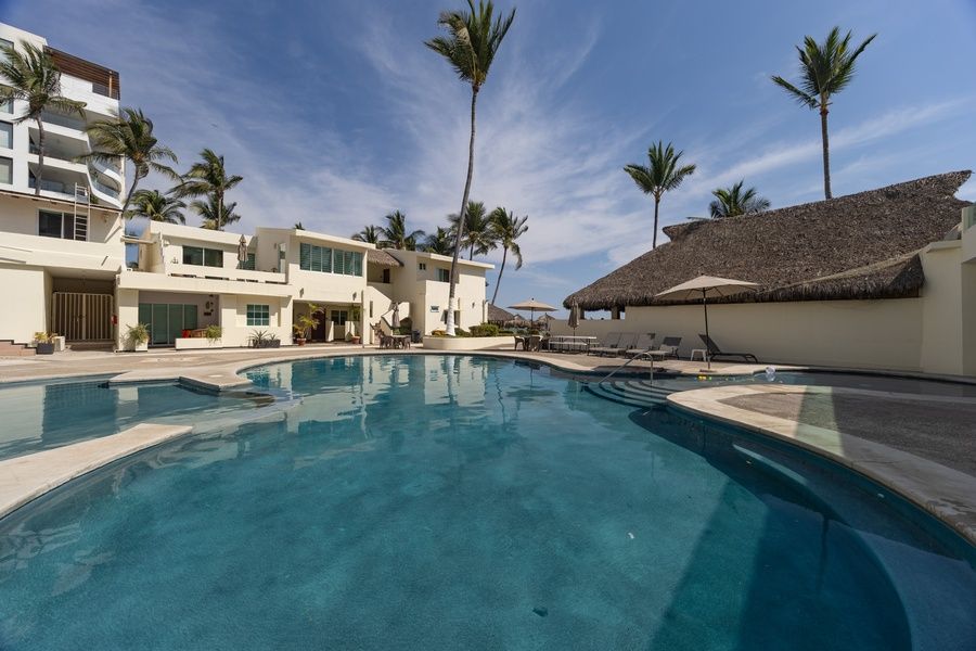 Enjoy the views from the balcony. Table for two and additional seating. Costa Dorada offers you a sparkling swimming pool and shallow area for children that is right below your balcony. You will find rooftop chaise lounges as well as umbrella topped picnic tables. A short walk takes you to the beach at Banderas Bay! There are palapas for shade here.