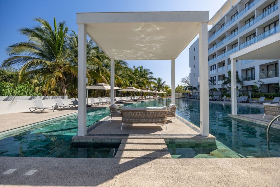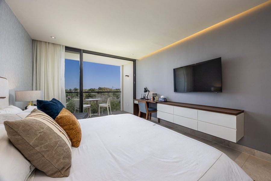 Luxurious style in this Studio unit in Nuevo Vallarta. Two pools, I parking space, concierge service. Mio Residences is a Studio featuring contemporary suite style bedroom with private bathroom with a bathtub, king sized bed, and a 55" TV and writing desk. They also offer a small kitchenette with coffee machine, minibar, and sink, and are equipped for 2 people.