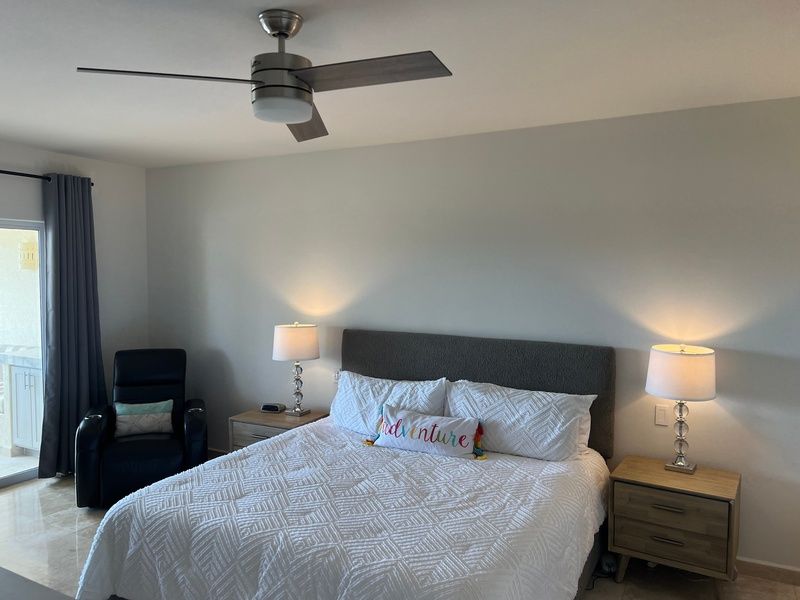 In the master bedroom, a king-sized bed reigns supreme, commanding attention amid. A generously sized TV, mirroring the offerings of the living room, provides the perfect retreat for cozy nights in, while a leather reclining chair bathes in the sunlight streaming through glass sliding doors. An ergonomic workstation, complete with a large monitor, transforms remote work into a seamless experience, allowing you to effortlessly blend productivity with relaxation. Adjacent lies the ensuite sanctuary, boasting double sinks framed by a sprawling mirror, an extra large bathtub nestled within marble tiles, and a shower ensconced by walls of pristine marble.