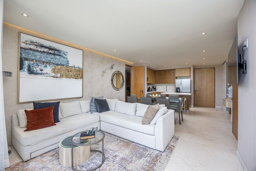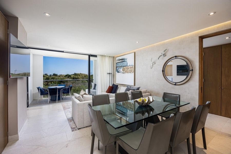 Luxurious style in this 1 bedroom unit in Nuevo Vallarta. Two pools, I parking space, concierge service. Mio 306 is a one bedroom apartment featuring contemporary suite style bedroom with private bathroom with a bathtub, king sized bed, and a 65" TV. The living room includes an L shaped sofa that converts into a bed, and a 55" TV. The dining table seats six, and a kitchen equipped with all appliances along with a Nespresso capsule coffee machine.