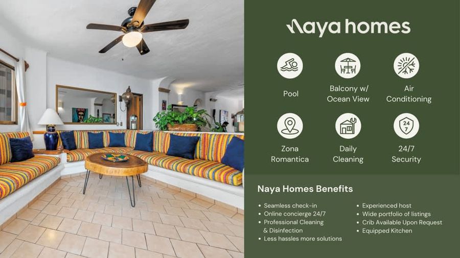 FROM DECEMBER 2024 TO MARCH 2025 CHECK OUTS WILL BE ON SATURDAYS ONLY. Spend your holidays in this two-bedroom unit right in front of the beach in the heart of Zona Romantica, the most sought-after spot in Puerto Vallarta: • Two bedrooms with 1 King bed each • Private balcony with a fantastic view of Playa de los Muertos beach • Daily cleaning, excluding Sundays • A/C in bedrooms • Beachfront building in a prime location (Zona Romantica) • Rooftop heated swimming pool, which overlooks the beach • 24/7 security in the lobby Escape to paradise and enjoy the ultimate beachfront getaway in the heart of Zona Romantica, Puerto Vallarta's most coveted location. Immerse yourself in the luxurious amenities of this two-bedroom unit with breathtaking ocean views and a private balcony overlooking the stunning Playa de los Muertos beach. Relax and unwind in the comfort of your fully air-conditioned unit, which has a plush king-size bed and two cozy twin-size beds to accommodate up to four guests. You'll enjoy daily cleaning service (excluding Sundays), ensuring a stress-free stay with nothing to worry about. Indulge in the rooftop heated swimming pool, which offers a panoramic view of the beach, providing the perfect backdrop for soaking up the sun and taking a refreshing dip. You'll also appreciate the added peace of mind of 24/7 security in the lobby, making your stay safe and secure. Take advantage of this incredible opportunity to experience the ultimate beach vacation in Puerto Vallarta. Book your stay today and discover why this beachfront unit is the perfect spot for your next holiday getaway. Naya is dedicated to ensuring your stay is smooth and comfortable. Days before the arrival, one of our happiness agents will reach out to you to coordinate the key delivery. Please feel free to reach us anytime if you have issues or need any recommendations. Welcome to Old Town, also commonly known as the “Romantic Zone” (Zona Romantica). This neighborhood is famous for its authentic Mexican architecture, stunning sea views and bustling LGBTQ+ nightlife. This neighborhood is perfectly situated near Puerto Vallarta’s most popular beaches, Playa Olas Atlas and Playa Los Muertos, making it the perfect spot to lounge by the beach during the day and explore Puerto Vallarta’s bar and restaurant scene by night. Zona Romantica is a highly walkable area, where you can access the beach and the restaurant and nightlife safely at night. Puerto Vallarta is well connected by Uber and Taxi’s (negotiate!). Important: Potential street noise from 8am to 8pm. 1. The property and the specific unit in the reservation shall not be used by more than the number of people or pets listed in the reservation. All guests will have to register with Naya Homes before their arrival, and additional guests may incur additional costs or the cancelation of the reservation, without a refund, according to Naya Homes cancellation policies. Guests outside the reservation details may not be permitted according to building rules. 2. By booking with Naya Homes, regardless of the platform used, guests agree to provide all necessary check-in information, including but not limited to copies of valid identification (such as a driver's license or passport), full names and ages of all guests, email addresses, and contact phone numbers. Guests will also complete any required admissions forms and documentation. Failure or refusal to provide the requested information and completion of the admissions forms may result in the immediate cancellation of the reservation without any refund. 3. All guests must honor the peace and privacy of their neighbors, refrain from participating in any unlawful activities, and adhere to the building regulations diligently. Non-compliance may result in the termination of your reservation without refund or financial penalties, as stipulated by either the building management, the host or Naya Homes. 4. Please respect the tranquility of our community by adhering to quiet hours from 10 PM to 8 AM. Non-compliance may result in the termination of your reservation without refund or a financial penalty added to your reservation costs. 5. No parties or gatherings of any kind are permitted. Non-compliance may result in the termination of your reservation without refund or a financial penalty added to your reservation costs. 6. Pets are not allowed unless expressly noted in your reservation. If you bring a pet to a property that does not allow pets, your reservation may be immediately canceled without a refund. For units where pets are specifically allowed, an additional special Pet Cleaning fee and a standard cleaning fee will be charged on top of the reservation if you bring a pet. 7. No smoking is permitted anywhere on the premises or in the building's common areas. A fine will be charged to the reservation if this is not respected. Casago - Puerto Vallarta has engaged VacayHome to ensure this listing contains all the information you need and that it is easy for you to book via search engines & online channels. VacayHome is connected directly to the property management system used by Casago - Puerto Vallarta which ensures that availability & rates are up-to-date & accurate. When you book, VacayHome processes payment on behalf of Casago - Puerto Vallarta and a charge will appear on your statement as "VacayHome". VacayHome will send you a confirmation e-mail that contains all the information you need to prepare for your vacation including arrival instructions. VacayHome has a 24 x 7 team to assist you with any questions or concerns you may have prior to arrival. To access VacayHome, obtain the customer support telephone number or read FAQs, please click on the links at the bottom of this page.