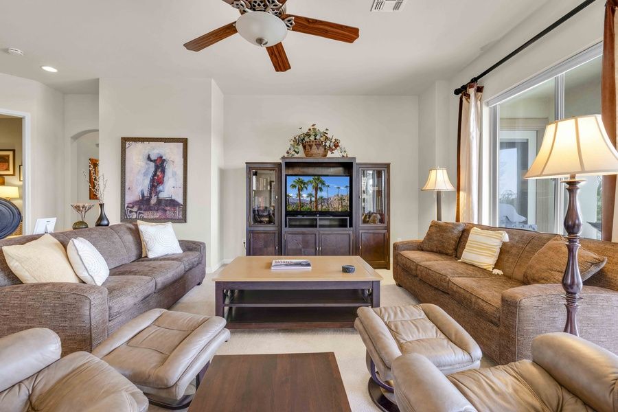 CITY ID #051716 TEMPORARY PICS - NEW SET COMING SOON This beautifully furnished home in the 55+ Sun City Shadow Hills community offers a perfect blend of comfort, elegance, and resort-style living. With stunning triple fairway views, mountain backdrops, and a private pool and spa, it's an ideal retreat for relaxation or entertaining. Highlights • 3 bedrooms • 2 bathrooms, including spacious primary ensuite • Private pool and spa with fire pit and covered patio • Breathtaking golf course, lake, and mountain views • Fully furnished home with stylish finishes and ceiling fans throughout •Located in Sun City Shadow Hills 55+ community with abundant amenities The Space Inside, the home features an inviting open floor plan with large living and dining areas designed for comfort and easy entertaining. The updated kitchen includes double ovens, a range top, breakfast nook, island, and bar seating for casual meals. A den provides a flexible space for an office, reading nook, or creative studio, while a hobby room invites you to pursue passions or projects. Tile floors throughout the common areas ensure a polished look, while carpeted bedrooms add warmth and comfort. Sleeping Arrangements • Primary Bedroom: King bed, ensuite bathroom with dual vanities, and plenty of closet space • Guest Bedroom: Queen bed, adjacent to full guest bath • Guest Bedroom: Queen bed, lofted twin bed above Outdoor Living Step outside to your private oasis featuring an expansive covered patio, built-in fire pit, heated pool, and spa. Overlooking the 18th tee lake and triple fairway with breathtaking mountain views, this space is perfect for morning coffee, evening cocktails, or stargazing under the desert sky. Community Amenities Sun City Shadow Hills offers two championship golf courses, a state-of-the-art fitness center, tennis courts, multiple swimming pools, and a clubhouse with endless social activities, hobby clubs, and fitness classes. Location Located in Indio, this home is just a short drive from shopping, dining, and the lively attractions of Palm Springs and the Coachella Valley. Pool Heat Ensure a comfortable swim with optional pool heating, available upon request at booking or before your arrival. The pool is heated to 87º from 7 AM to 7 PM throughout your stay. Rates vary by season: • November–March: $75/night • April, May, October: $50/night • Not needed in other months For stays under 7 nights, pool heat must be purchased for the entire stay—we cannot heat it for select days. A 24-hour notice is required to ensure optimal warmth on your first night. Heating begins the day before your arrival at no extra charge. Hot Tub Indulge in the ultimate relaxation with our hot tub, conveniently heated at your fingertips using a remote control. Please note that the hot tub is not pre-heated before arrival, but worry not—there's no extra charge (even if not opting for pool heat) to enjoy its warmth. Simply activate it whenever you desire, creating the perfect atmosphere for a soothing soak during your stay. Utility Surcharge For stays of 29 nights or longer between June 1st and September 31st, a $750/month utility surcharge will apply to help cover the additional energy costs associated with cooling the home during the summer heat. Additional Policies & Rules • Low outdoor music is allowed at levels that will not disturb the neighbors. • 100% quiet hours outside from 10pm-7am • No smoking inside home • Renter must be 55+ years of age • Guests will sign a Ryson "Terms and Conditions" form and City Ordinances require a copy of your ID to Ryson prior to the day of your arrival. Ryson Vacations has engaged VacayHome to ensure this listing contains all the information you need and that it is easy for you to book via search engines & online channels. VacayHome is connected directly to the property management system used by Ryson Vacations which ensures that availability & rates are up-to-date & accurate. When you book, VacayHome processes payment on behalf of Ryson Vacations and a charge will appear on your statement as "VacayHome". VacayHome will send you a confirmation e-mail that contains all the information you need to prepare for your vacation including arrival instructions. VacayHome has a 24 x 7 team to assist you with any questions or concerns you may have prior to arrival. To access VacayHome, obtain the customer support telephone number or read FAQs, please click on the links at the bottom of this page.