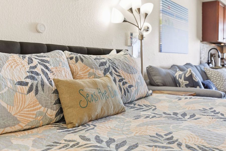 The studio layout is thoughtfully designed for comfort and simplicity. A plush king bed offers restful sleep with ocean views just beyond the door. The bathroom is stocked with soft linens and essentials so you can pack light and feel at home.