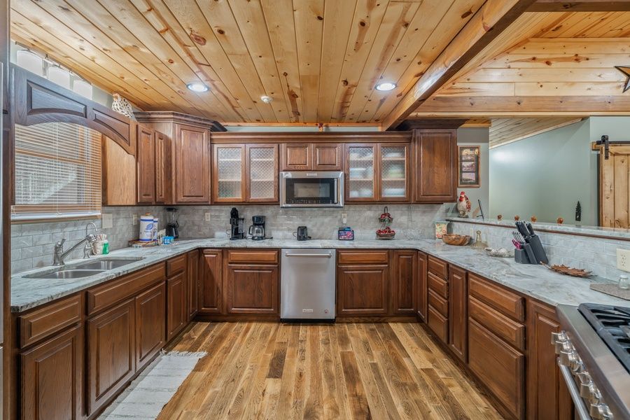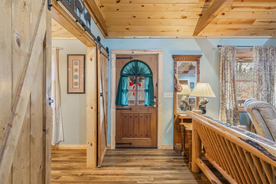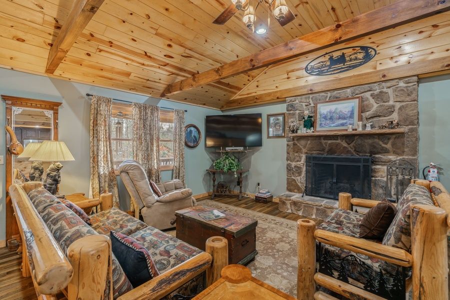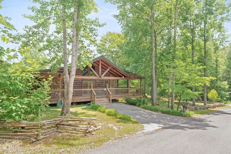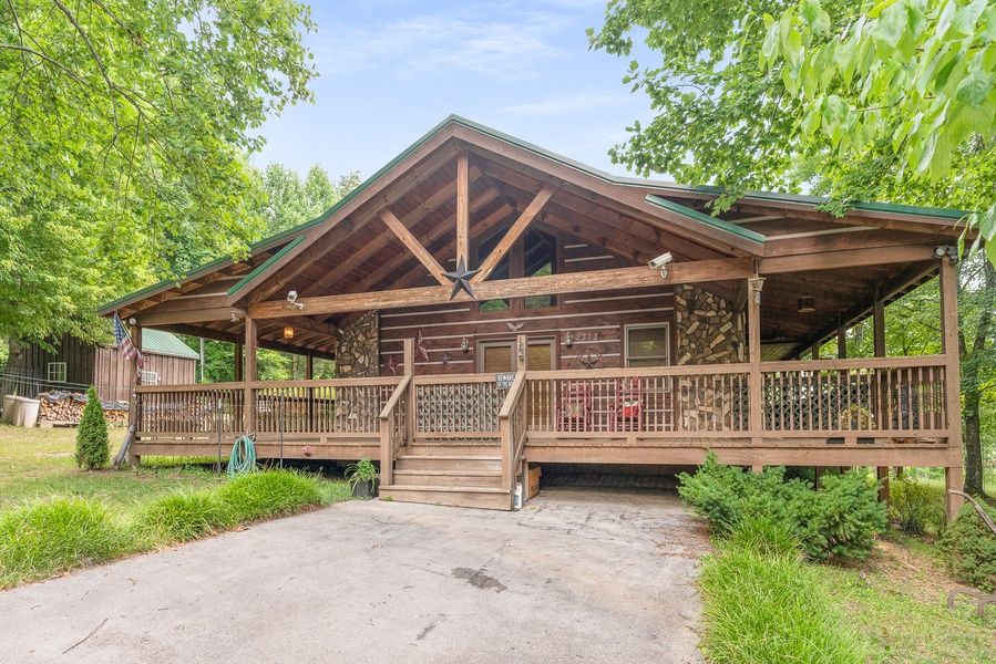 3BR/3BA CABIN Tucked in a wooded park-like setting. The Interior features everything on one level, vaulted ceilings with wood beams, tongue and groove, and hardwood flooring. Oversized upgraded kitchen with a snack bar to seat several, granite countertops, stainless appliances, gas cooktop range, and plenty of cabinet space. Spacious living room with wood-burning fireplace and a bonus room.Huge Master Suite with its own massive wood-burning fireplace, full bathroom with steam shower with jetted tub, double vanity, french doors leading to covered deck, and soaring vaulted ceilings with double closets. Wraparound covered porch/deck on three sides with so much space for rocking, swinging, grilling outdoors, seating, etc. The setting is one of a kind, with mature landscaping and hardwoods. Walk into the laundry room. Plenty of parking areas on the property for multiple vehicles. Easy access, NO STEEP ROADS! Convenient location only minutes to attractions, Dollywood, shopping, or Gatlinburg. If you want family time, Picture perfect is the cabin to be at.