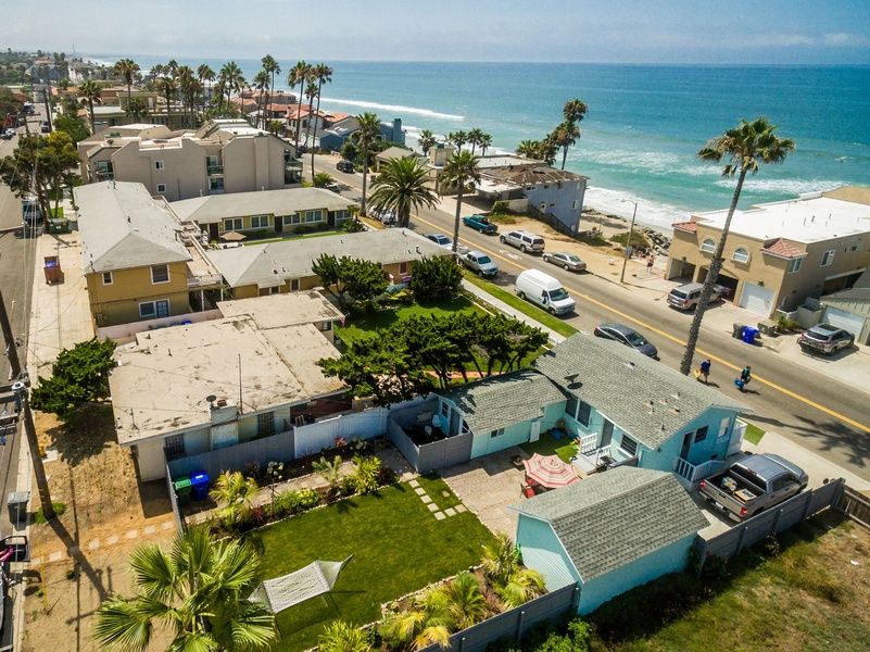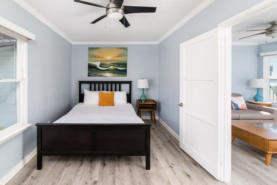 Stretch out on the hammock in the landscaped backyard and fall asleep to the sound of the waves crashing. This remodeled beach bungalow has a soothing blue palette, a private entrance tiny house and ocean views from the front porch.