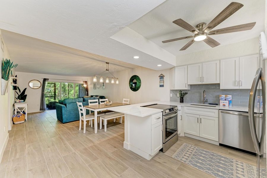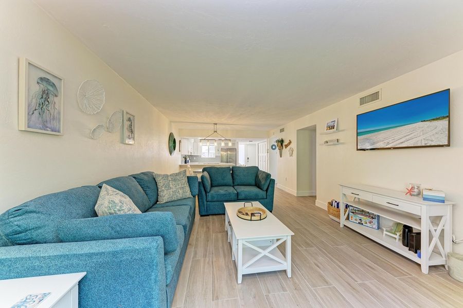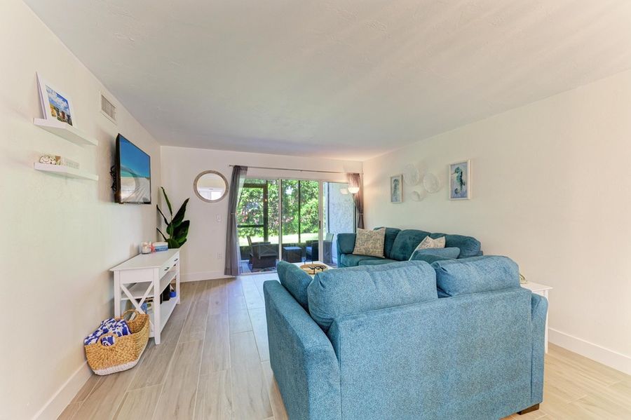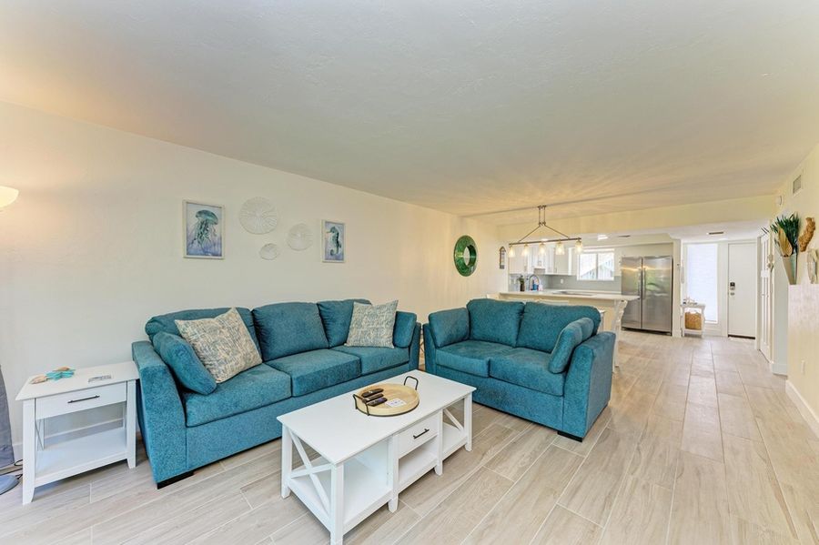 The unit recently was beautifully and comfortably updated with new flooring throughout the entire unit, new bathroom vanities, new dining furniture, new living room furniture with a Queen XL sleeper sofa, a new king master bedroom set, new luxury memory foam mattresses and bedding on all beds, and new smart tvs in both bedrooms. The second bedroom includes queen and twin beds. The condo also has a fully equipped kitchen with new refrigerator with ice maker, new dishwasher, electric range, and keurig! It also has a washer and dryer and a beach closet in the lanai stocked with beach wagon, chairs, fishing rods, floats, and toys. New lanai furniture will be in place before bookings open in April.