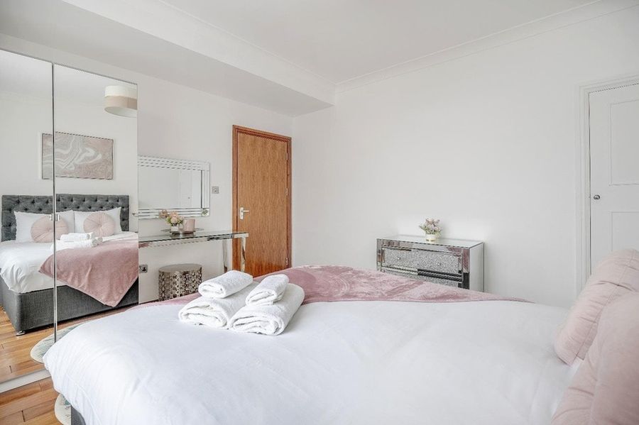 This bright and spacious one-bedroom apartment offers a deluxe king-sized bedroom, a bathroom with a bath, and an open-plan living area with a dining space. The modern kitchen is fully fitted with integrated appliances, while large windows flood the space with natural light. The apartment features wooden flooring throughout, with stylish tiling in the kitchen and bathroom, and is equipped with a smart TV for added convenience.