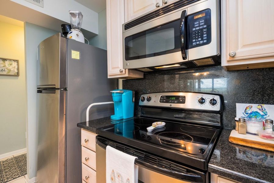 A galley-style kitchen offers stainless steel appliances and all the essentials for easy vacation living.