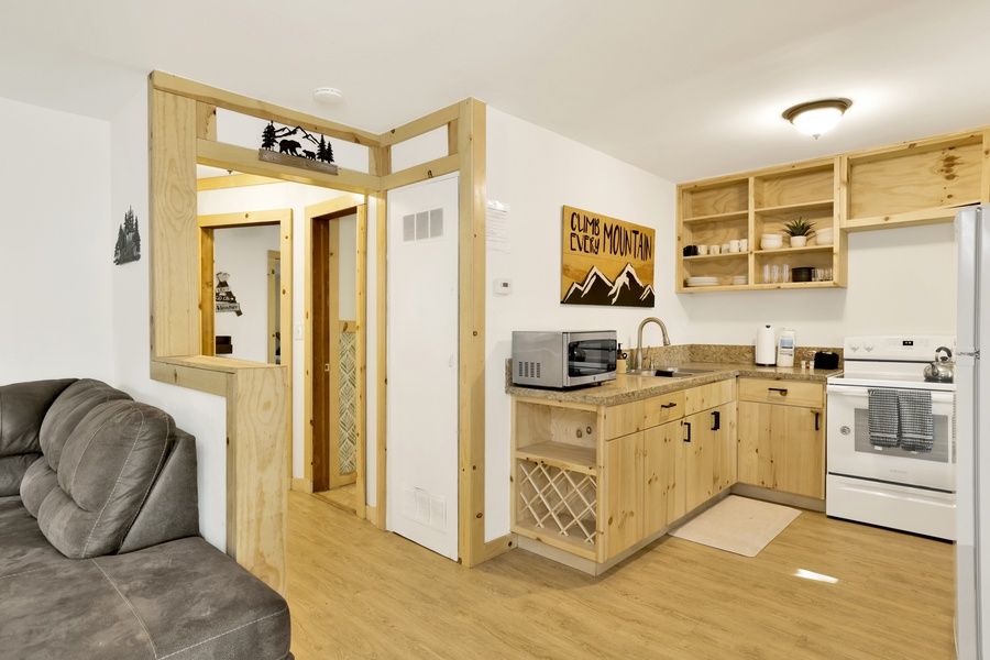 Upon entry, you are greeted with freshly laid hardwood floors, open windows, and new furnishings that will make you feel right at home. Relax on the couch and warm your toes in front of the toasty fireplace as you pop on a movie on the flatscreen Streaming TV and enjoy the forested views outside. Enjoy preparing and enjoying your home-cooked meals right here at the cabin within the equipped kitchen and dining area, complete with cookware and appliances. Enjoy convenient access to your sleeping areas and bathrooms; each is made up for your arrival with warm linens and fresh shower towels for your group.