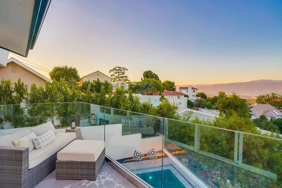 With high-end amenities like voice-controlled lighting and music plus a private backyard with a heated pool and spa, this luxury rental allows you to live like the Hollywood elite. Glass walls open up the home to the beautiful outdoor areas, complete with an expansive patio, pool, spa, and stunning views of the canyon, mountains, and city.
