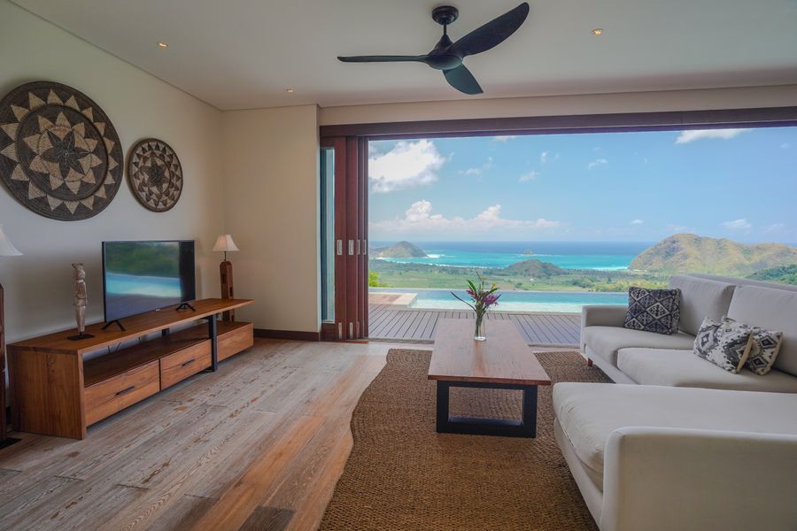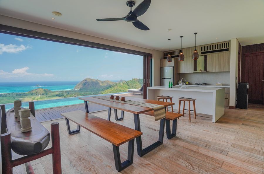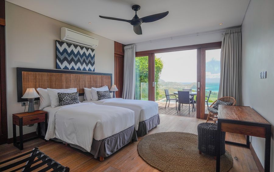 Nestled high on lush hillsides with panoramic views of aquamarine seas and the pristine curve of Selong Belanak Beach in southern Lombok.