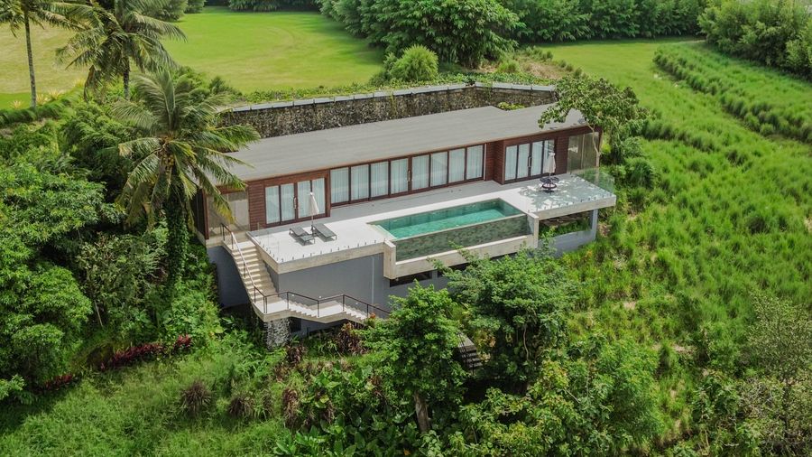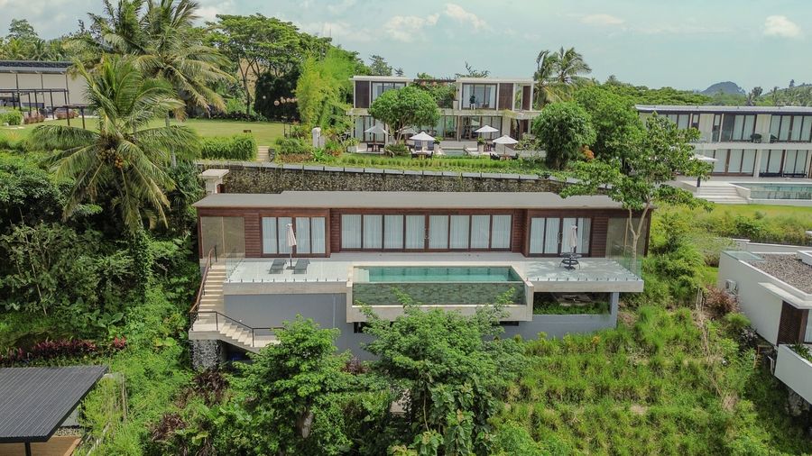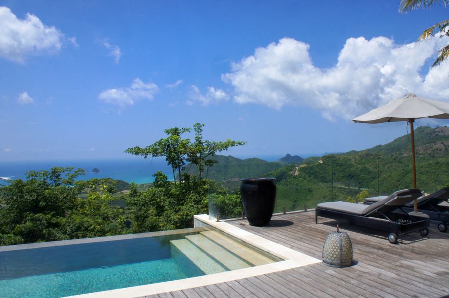 Nestled high on lush hillsides with panoramic views of aquamarine seas and the pristine curve of Selong Belanak Beach in southern Lombok.