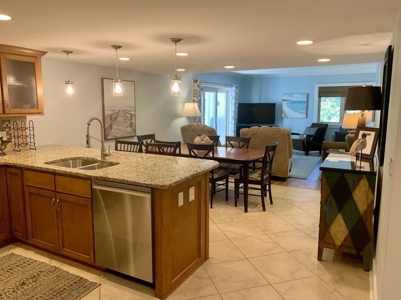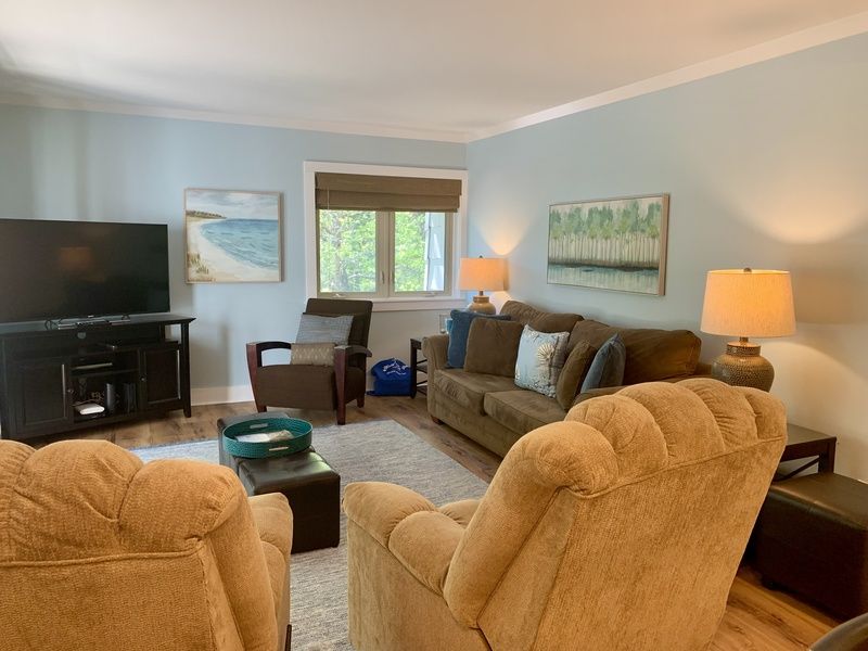 The open living space stretches from the chef’s kitchen out to a living room space, marked by sleeper sofa and loveseat in comfortable microsuede. The front a flat-screen TV as well as sliders that give way to a cozy patio enjoying lofty views of Atlantic Dunes’ 9th hole.