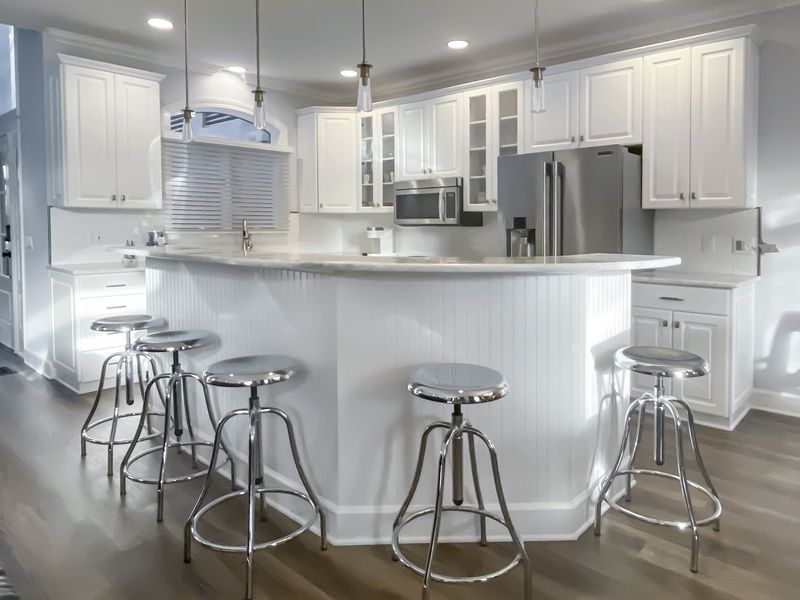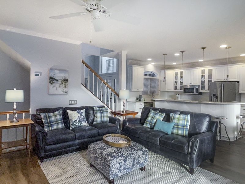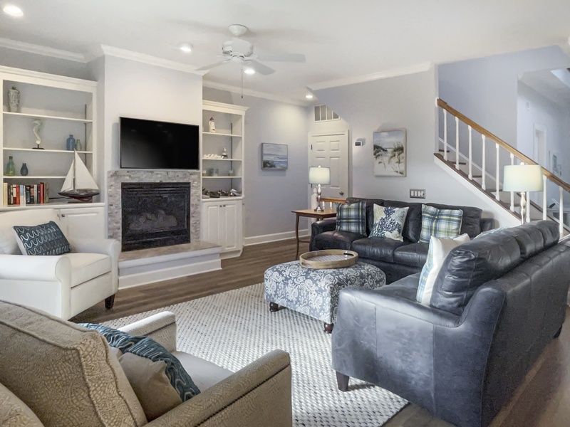 Inside, the main floor’s open-concept great room welcomes you with abundant seating, a large flat-screen TV, and a decorative fireplace. The modern kitchen features sleek quartz countertops and stainless-steel appliances, flowing seamlessly to the elevated rear patio. Here you’ll enjoy serene views of the Calibogue Sound and a gas grill for relaxed al fresco dining. A centrally located powder room offers easy guest access. All bathrooms throughout the home were newly renovated in 2025.