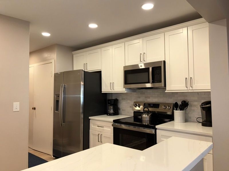 The main floor welcomes you with soothing neutral tones and flooring mimicking the look of hardwood, which runs throughout the marvelously open living space. It draws you toward a comfortable family room pairing dual armchairs against a plush sleeper sofa before a massive flat-screen TV. A bank of sliders open to a wide patio with mesmerizing oak-shaded lagoon views beyond.