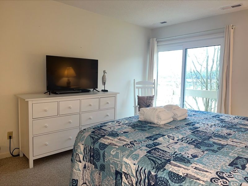 That scenery, a private view of Braddock’s Cove rife with oysters and wild birds, takes center stage in the main living spaces courtesy of a wall of windows which soar to the exposed-beam cathedral ceilings. Gaze out across the waters from the comfort of the armchairs and leather sectional sofa, or step through sliding glass doors and breathe it in from the wide wooden deck.