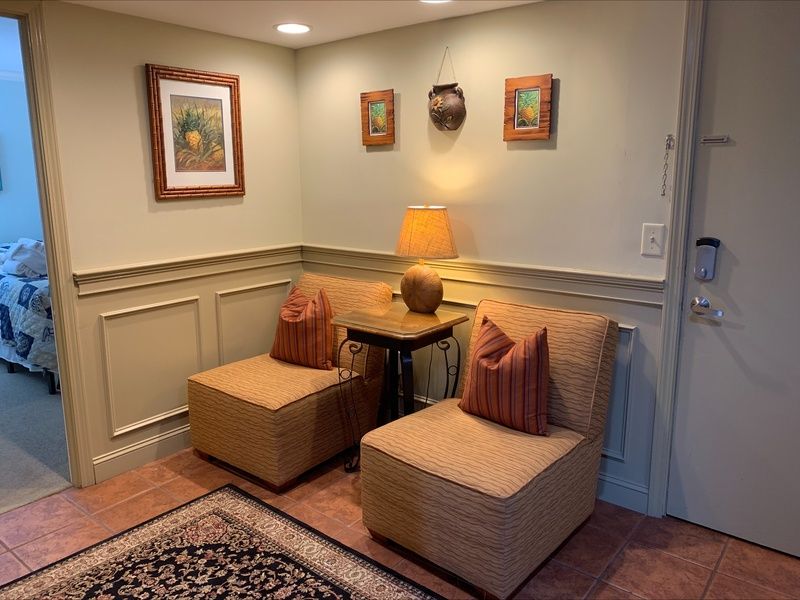Tiles in rich terra cotta greet you in an open foyer with a pair of armchairs emphasizing the sense of spaciousness, while masterfully crafted wainscoting and crown moulding draw your eye into the open living space. Here a sleeper sofa in plush taupe linen and a pair of armchairs in floral-inspired patterns face a large flat-screen TV and a beautiful view of the clubhouse through sliding glass doors. Step through, and you’re on a roomy private balcony staring right down the 9th fairway of the world-famous Harbour Town Golf Links.