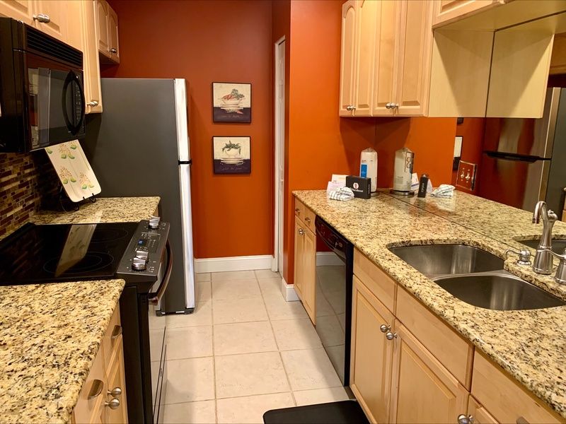 A pair of immensely comfortable bedrooms both offer their own dazzling touches. The master wraps a plush king-size bed in rich coral linens and surrounds it with tall windows facing out to the clubhouse. A sizable niche in one wall holds bench seating, amplifying the sense of space in a room that also boasts an armoire housing a flat-screen TV, rocking chair and en suite with single basin vanity and walk-in shower with beautiful custom tilework.