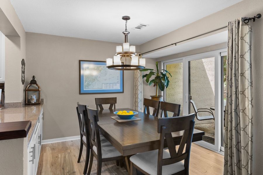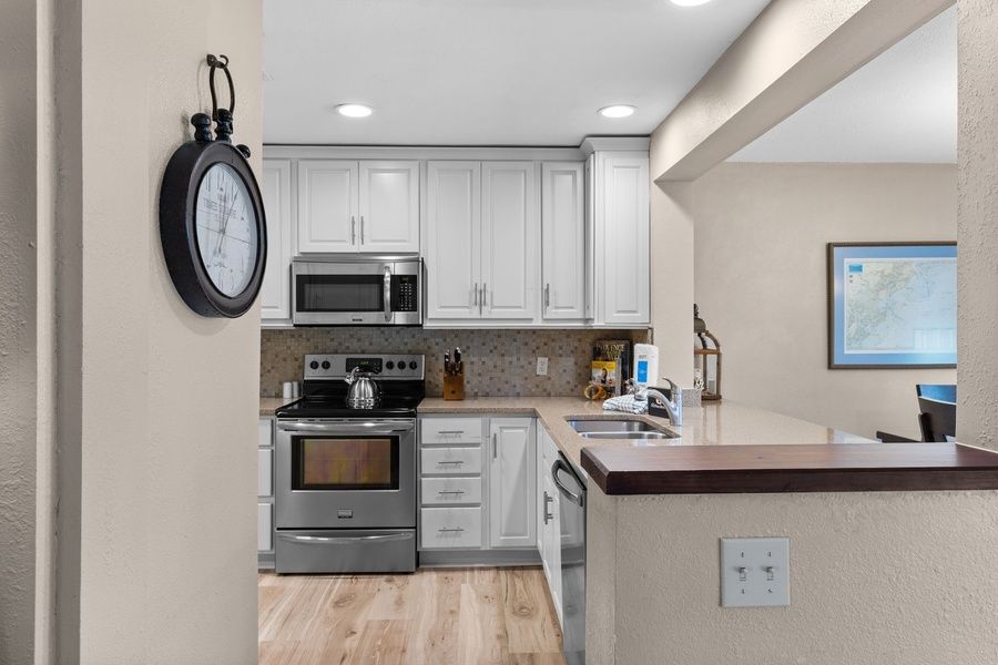 Glass-inlaid French doors to one side and a wall of sliding glass doors to the other fill the open living space with natural light, while showcasing sweeping golf views. A coastal-inspired paneled accent wall breathes comfort into a space boasting a wide sleeper sofa, loveseat and armchair plus a massive flat-screen TV. The nearby dining space offers seating for six around a wide oak table between exquisite golf views and eye-catching built-ins in wide composite countertop. This counter unites the space with the lavishly upgraded kitchen, boasting tile backsplash, stainless steel appliances and a fresh modern look.