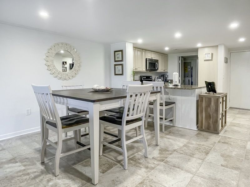 The beautifully open floor plan guides your eye toward that view, stopping to take in the lushly updated décor along the way. Your first stop is the spacious kitchen, where updated cabinets and granite counters set the stage for a gourmet paradise of stainless steel appliances and all the amenities of home. Passing through the coastal dining room with seating for six, we come to the main living space where dual sleeper sofas face a flat-screen TV as well as a wide set of sliders.