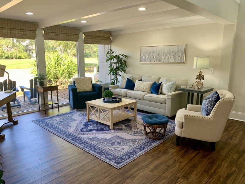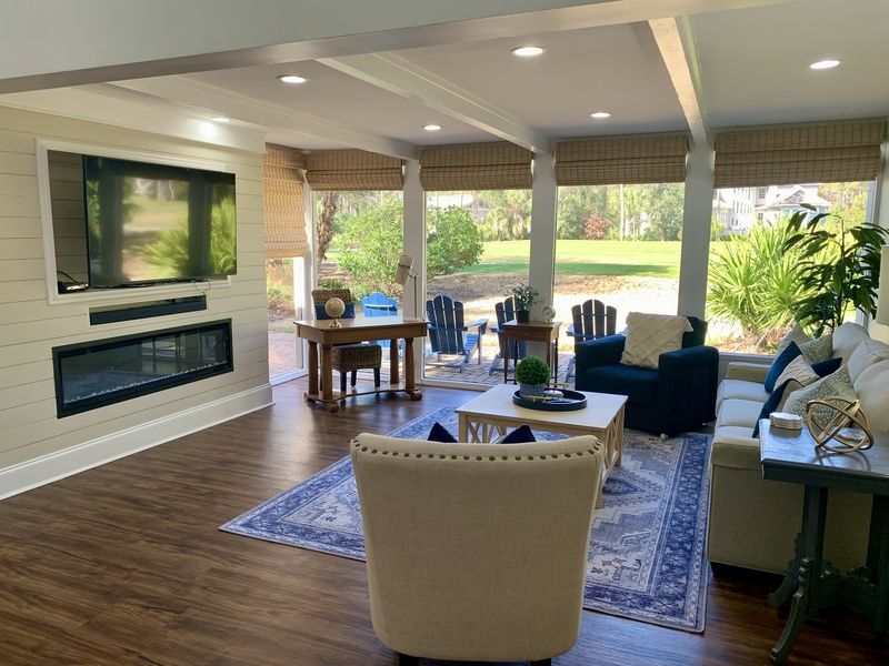The lushly open main living spaces exult in natural daylight from tall ceilings that soar up toward skylights. From here, you an enjoy a panoramic view of the 12th hole at Atlantic Dunes just beyond a picturesque stone patio that fills the entire space. Take in the view from the spacious Carolina room where sofa and dual armchairs face an accent wall of shiplap, built-in flat-screen TV and decorative fireplace beneath exposed beam ceilings.