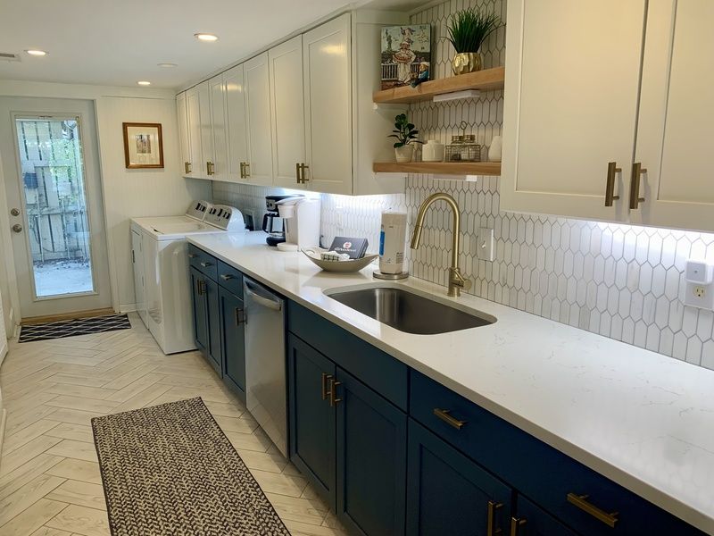 To the other side of this great room, a stately dining room with tray ceiling and chandelier offers seating for six flanked to one side by sliders that guide you out to a lovely patio. To the other side, the updated galley kitchen with its state-of-the-art appliances offers everything you need to create a gourmet meal, with a nearby washer and dryer for convenience.