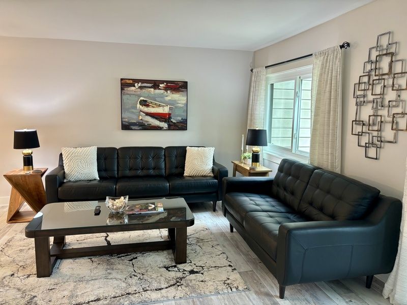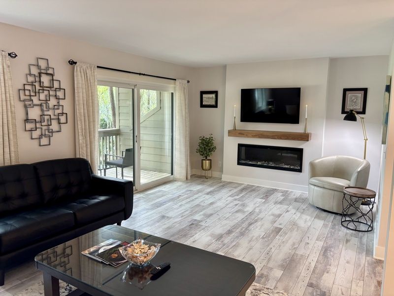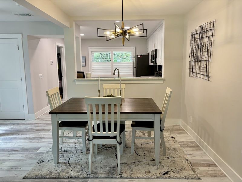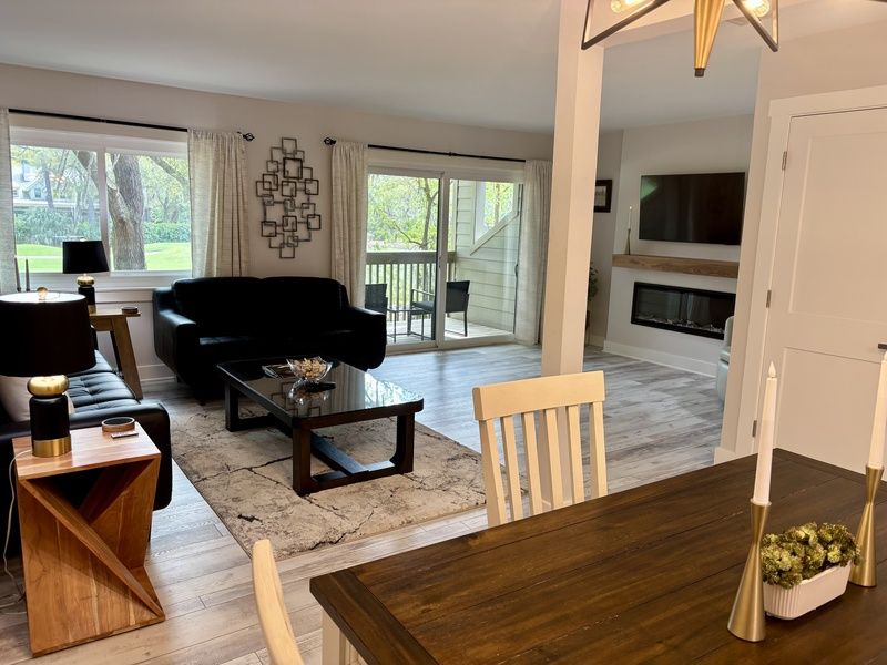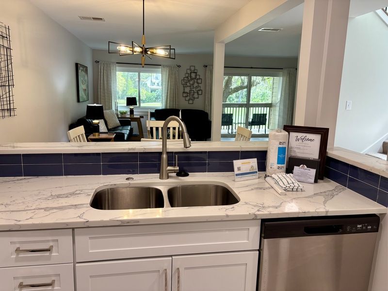 The property has been recently refreshed with a captivating robin’s egg blue paint scheme that runs throughout the open living space and beyond. An elegant dining space with high-top seating for four expandable to six around a delightful two-tone table greets you upon entering. Its casual yet upscale ambiance anchors an open living space.