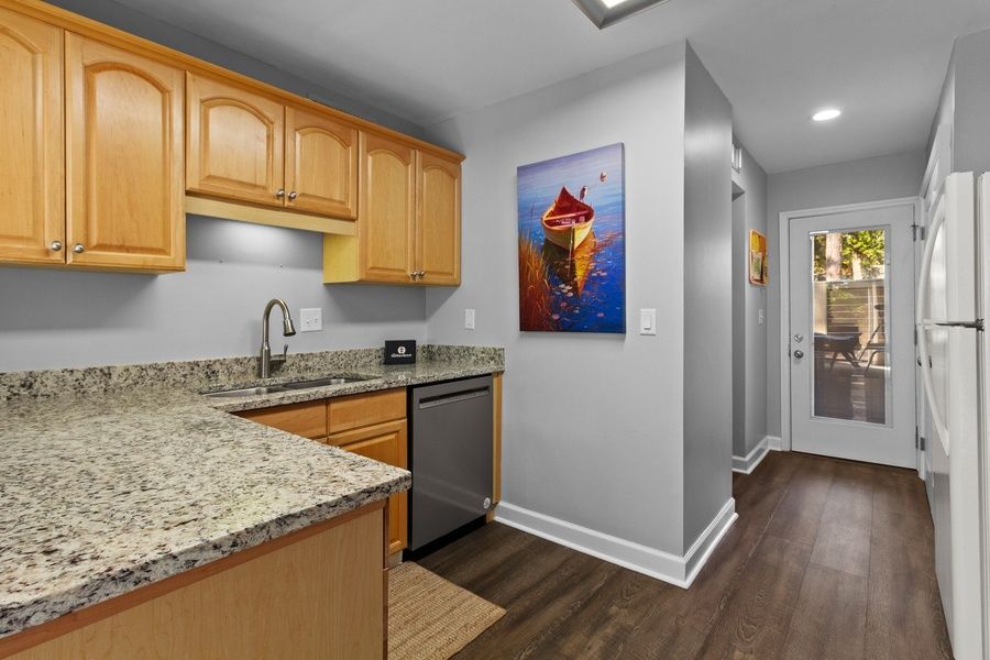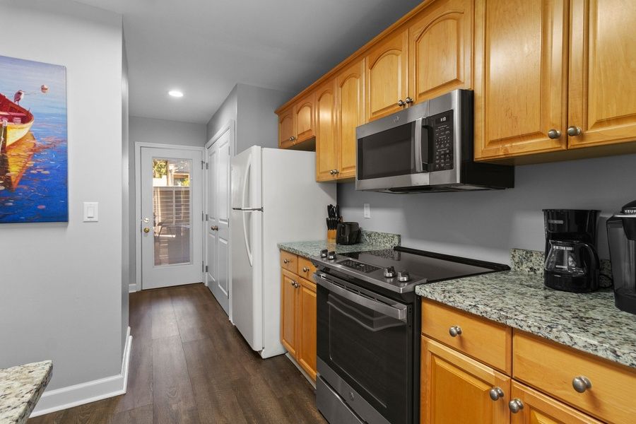 The kitchen even enjoys an open sense of airiness thanks to a pass-through leading out to the dining room. Here, wide countertops of mottled granite surround a kitchen with all the amenities you need to prepare an amazing meal, plus a nearby washer and drying for all the conveniences of home.
