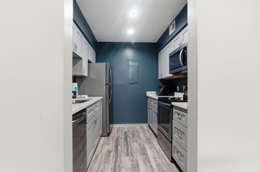 The open living space exults in lagoon views through walls of windows, illuminating a space with a sleeper sofa and loveseat facing a flat screen TV amid soft short-pile carpet. Follow the sight of that lagoon fountain toward the open dining room, where a farmhouse style table seats six amid panoramic views. Convenient to the dining room, the galley-style kitchen employs updated appliances and a generous footprint for easy entertaining.