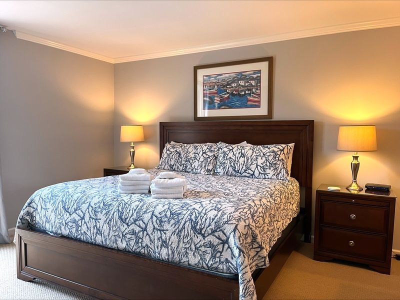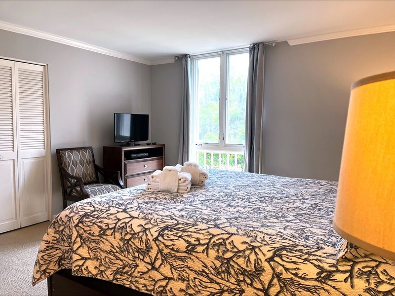 The spacious master bedroom in this unit carries the main living spaces modern flair, but the plush king size bed providing a sense of comfort and tranquility. Here you’ll also find a flat-screen TV, large floor-to-ceiling windows with landscape views and access to a heavenly private bath with granite-topped single basin vanity and walk-in shower with eye-catching tile work.