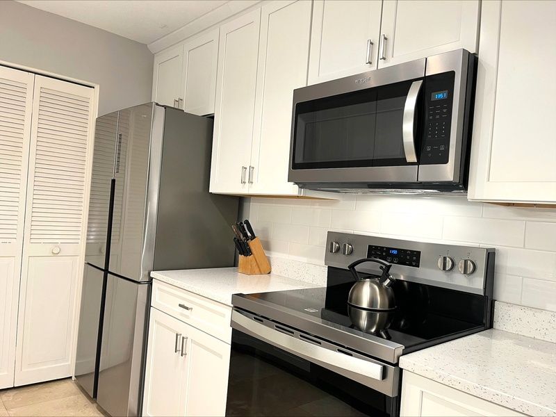 The newly updated interior dazzles with modern flair, while a sparkling mirrored accent wall in the dining room gives the entire space a sense of volume and elegance. Dining for four can be found around a stylishly modern beveled-glass top table, convenient to the wonderfully renovated galley kitchen. Here, brushed steel hardware and speckled granite in black and pearl highlight a newly transformed kitchen with all the amenities of home.
