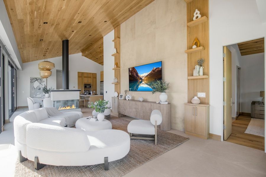 Step outside to a wraparound Ipe wood deck overlooking manicured grounds, a sparkling full-sized pool, a spa, and a tranquil cabana/massage room. The property’s two flat acres offer lush landscaping and multiple outdoor living zones, all enveloped in total seclusion.