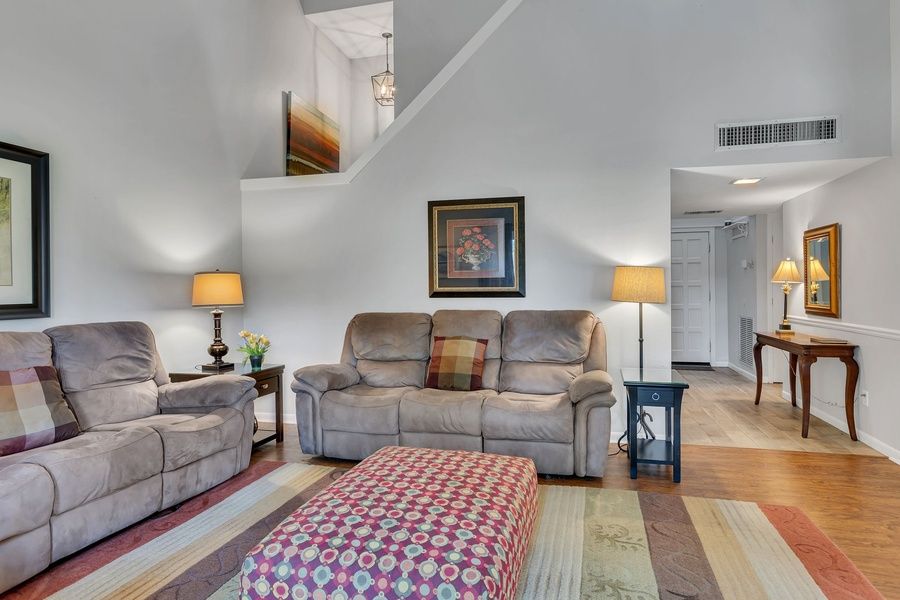 The loft space greets you as a balcony once you walk in, while elegant hardwood flooring beckons you to explore further. The peaceful grey walls segues beautifully into an inviting living space centered on a relaxing conversation area with two reclining sofas. The high ceilings allow natural light to spill into this room from the wide windows on the front of this villa. The real gem of this first floor, living space, however, is the rich wooded views just outside the sliding glass doors of the private patio and the first fairway of Harbour Town Golf Links just beyond.