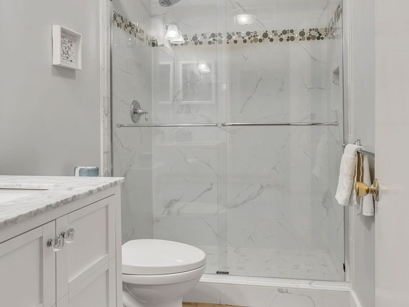 Rounding out the first floor is a master bedroom with king bed that contrasts the soothing green of the outer living space with a cool blue color palette and coastal-style furnishings. A foyer-type entrance can either be opened to provide the first floor with a full-bath or closed off to create the feeling of a private suite.
