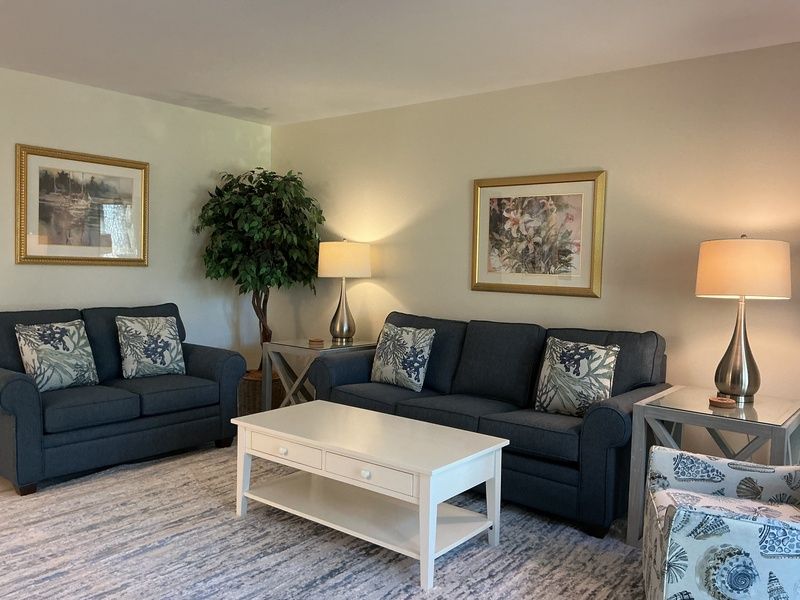 Royal blue slate flooring in the entryway gives way to marbled tile flooring, which runs throughout the main floor enhancing the elegance of a subdued Carolina blue paint scheme. This color scheme culminates beautifully in the main living space, where soaring windows let in ample natural light. A sleeper sofa and love seat in tasteful caramel and cerulean stripes face a large flat-screen TV before a set of sliding glass doors leading out to a pebblestone patio.