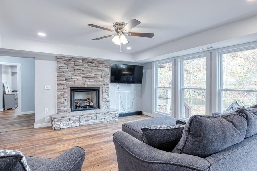 The main living area centers around a gas fireplace and opens to a fully equipped kitchen with granite countertops and stainless steel appliances. Upstairs, a second lounge is perfect for movie nights, game day, or keeping the kids occupied while the adults unwind below.