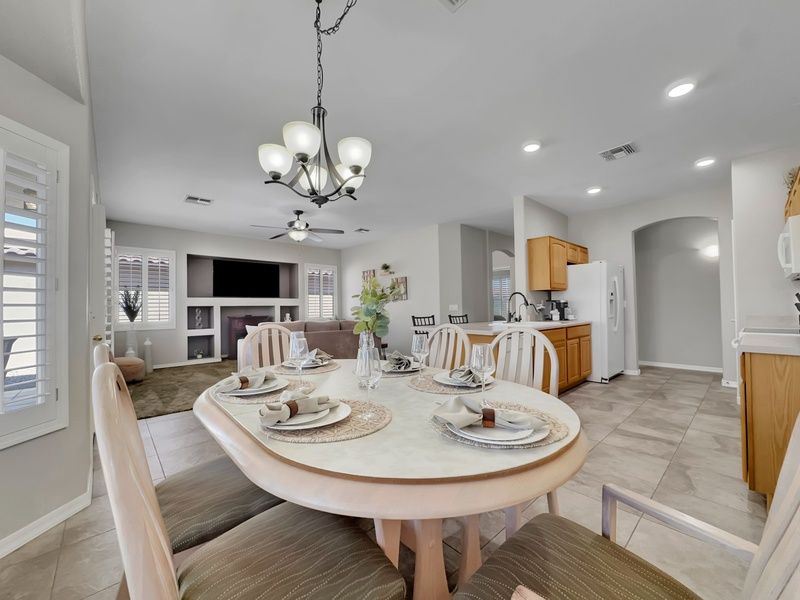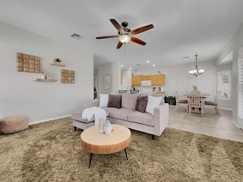 Welcome to the Bradshaw Chandler, a 55+ stunning 2-bedroom with a office/den home nestled in the vibrant active adult community of Solera Chandler, Arizona. This beautifully designed residence offers a serene garden view, perfect for relaxation and rejuvenation. With a spacious layout of 1,516 square feet, it comfortably accommodates up to 4 guests, making it an ideal retreat for seniors and their extended families. 30 Night Minimum.