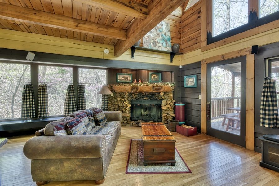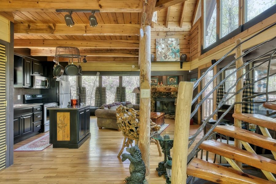The cabin’s warm wood interior and inviting décor create a cozy mountain atmosphere with a touch of artistic flair. A stunning spiral staircase leads to the upper level, adding a unique focal point that feels both rustic and timeless. Whether you’re curling up by the fireplace, sharing meals around the table, or simply enjoying the cabin’s thoughtful details, you’ll find comfort and character at every turn.