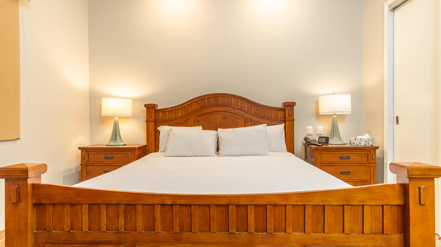 The main living area has a sofa, easy chair, and a leather recline chair as well. There is a raised cafe table for four diners, a desk area, along with a well appointed kitchen with attached utility room offering a washer and dryer. The bedroom and its attached bathroom has a king sized bed, double sink mirrored vanity, and a glass enclosed shower.