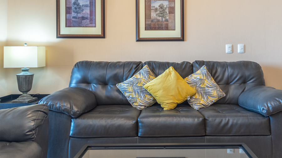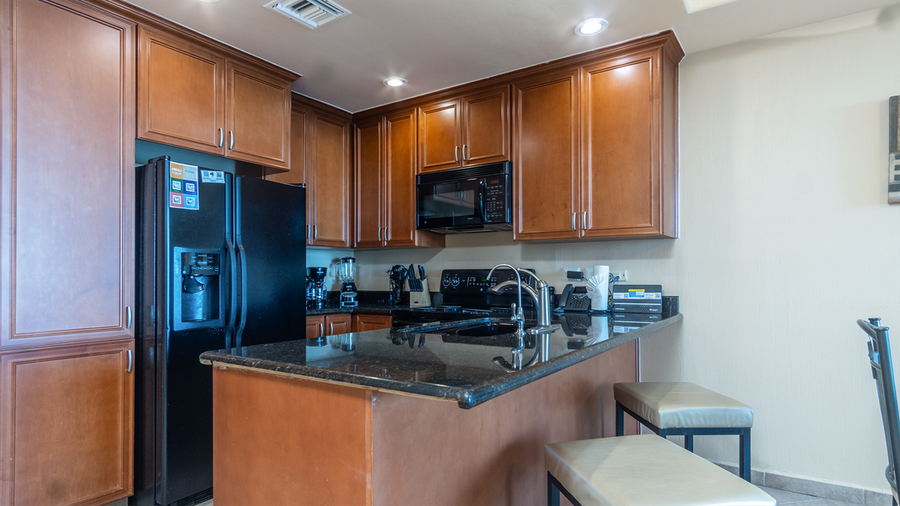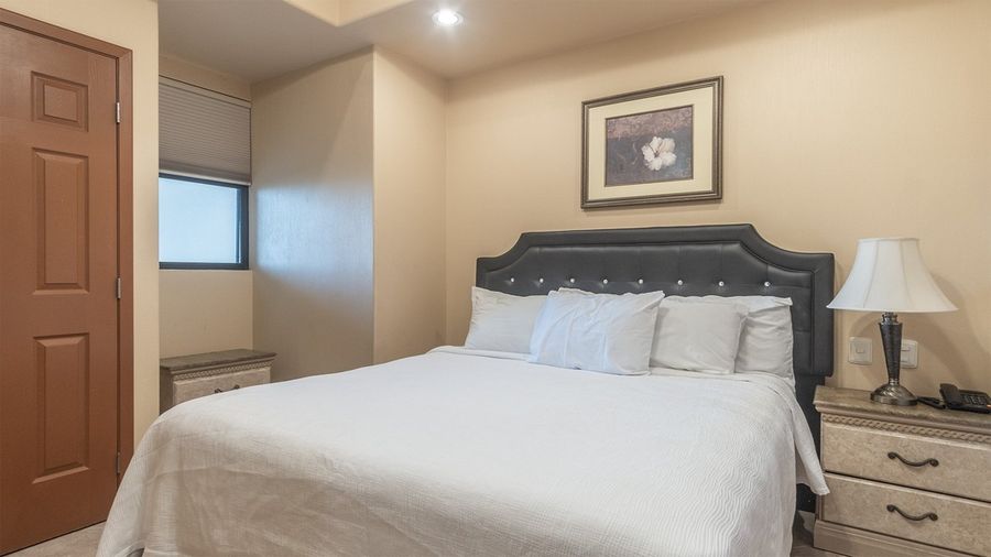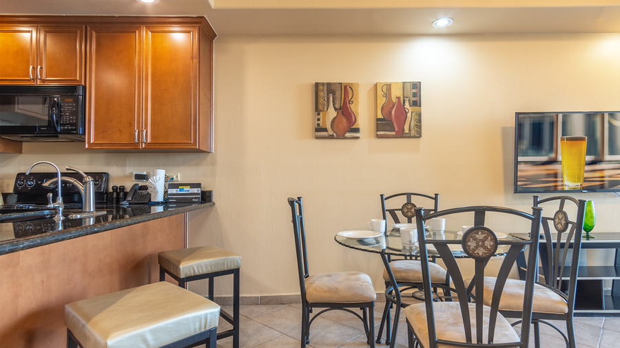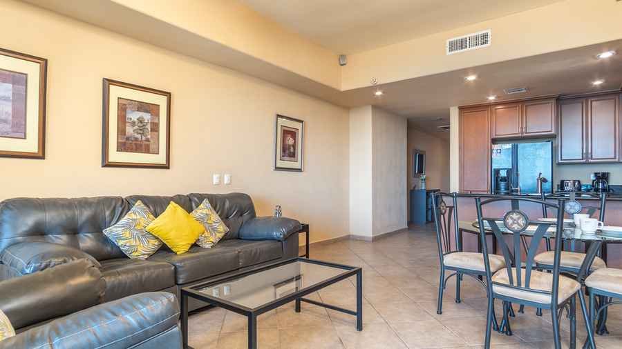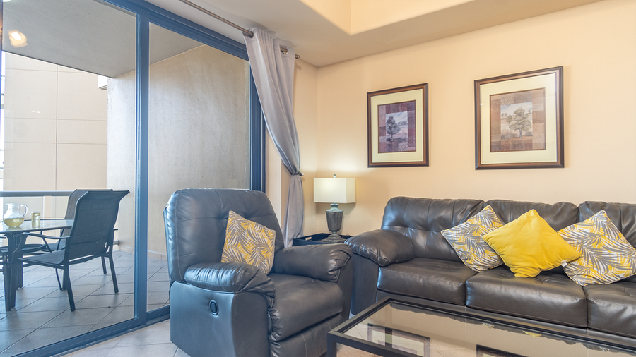 This one bedroom Las Palomas Resort condominium is just right for a weekend getaway for two or four visitors. The sofa pulls out into a bed, and there is a nice matching leather recliner in the living room as well. Set with a view across the patio, the living room is comfortable and just like home. The Resort is appreciated for its great location, tons of amenities, and fun vacation atmosphere that takes you world away from every day life.