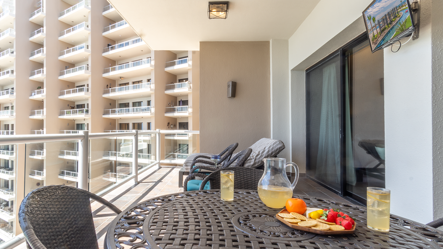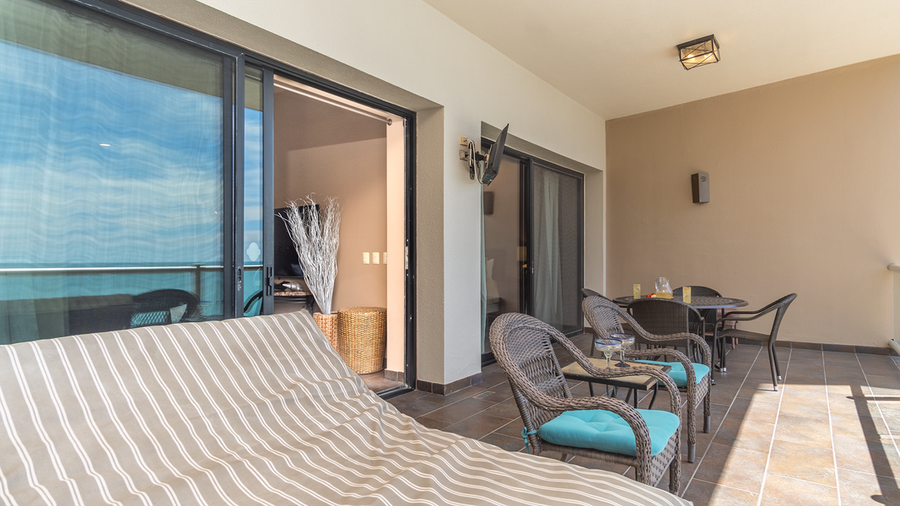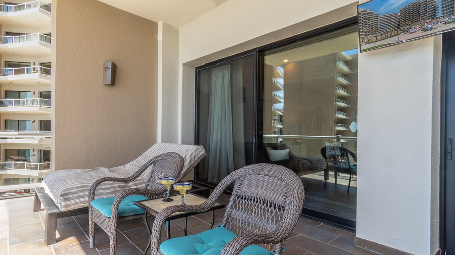 - [ ] Balcony set with a unique double upholstered chaise lounge, great for couples. There is also a full dining table, and an intimate cafe table for two as well