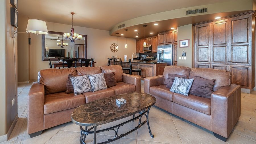 ~ The living room has two rich leather sofas, a TV, and a sliding glass door for balcony access
