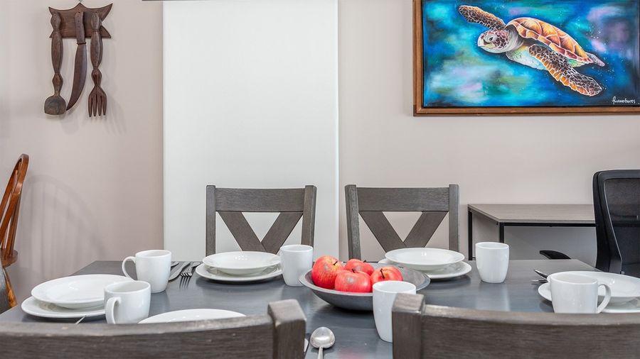 ~ The kitchen is immaculate, and provides a full complement of large appliances like stove and oven, refrigerator, microwave oven and dish washer. Small appliances like a coffee maker, blender and toaster are also available. Plenty of cookware and dishwater as well. The granite counter houses seats for casual dining options.