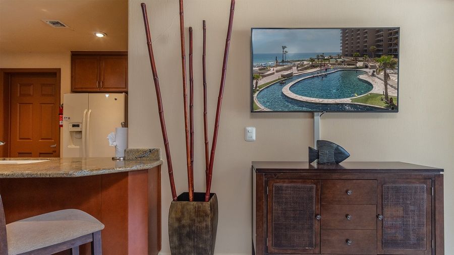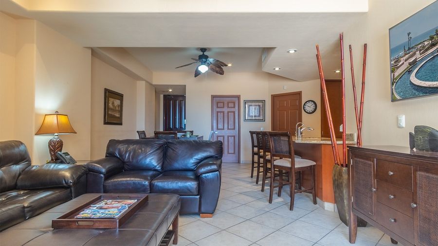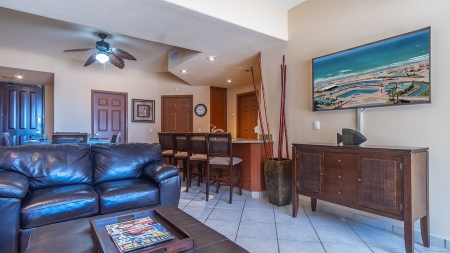 First floor elegance at th Las Palomas Beach and Golf Resort. The Master Bedroom has a King bed and in the living room, you have a sofa bed that pulls out to a sofa sleeper. A washer, dryer, and sink populate the clean up room, just off of the kitchen. The dining table seats four, and the balcony offers a cafe table and chairs for viewing the pool and beach area. Has plenty of lounge area for all the family. You will encounter a BBQ grill, Adirondack chairs, sofa and lots of space.